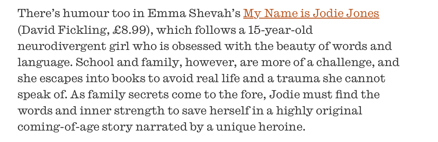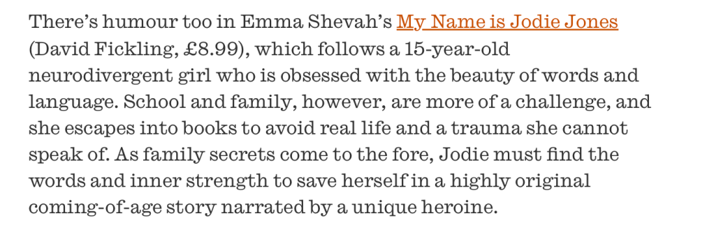 I am undone. What an extraordinary book! I’ve just finished reading My Name is Jodie Jones and I am beyond impressed – one of the standout books of 2025. @emmashevahauthor has created one of the most complex, interesting and unique characters in any book I’ve ever read. …The whole novel is a literature lover’s dream! But it’s so much more than that, it’s an examination of trauma, a mystery story, and an ode to friendship – Jodie Jones’ best friend, Becca is magnificent. The plotting is fiendishly clever, towards the end of the book I gasped when I realised what Shevah had managed to do. And some of the scenes made me sob for little Jodie Jones.